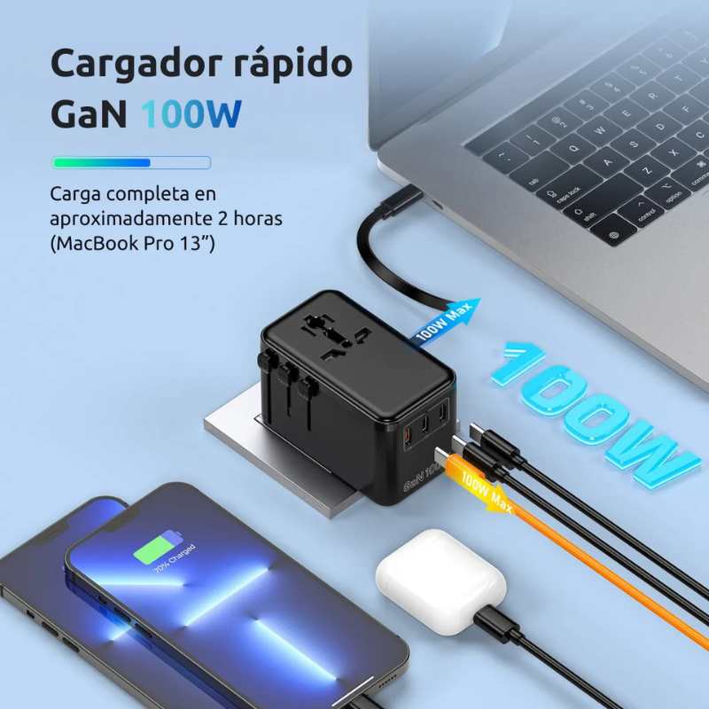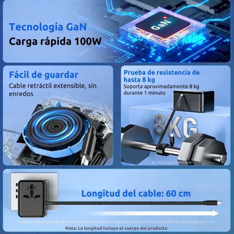 - Carga rápida USB-C hasta 100W (apto notebooks 65W, 87W y 100W)