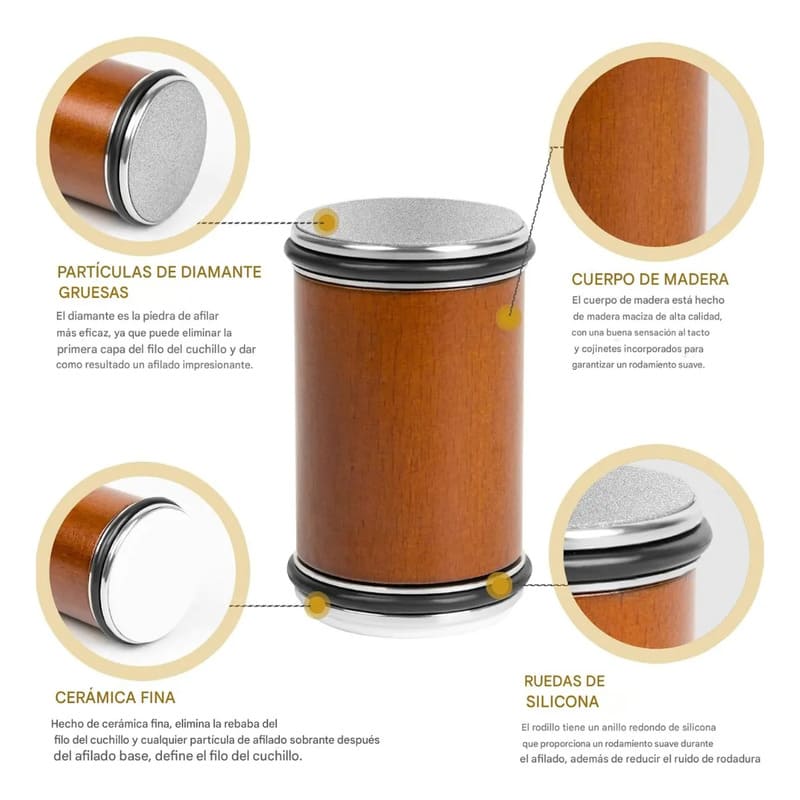 Compacto y cómodo de manejar, el rodillo mide 8.5 cm de alto x 5.3 cm de diámetro, mientras que las bases de afilado son de 10.3 x 6.1 x 2.5 cm. Un tamaño ideal para garantizar precisión sin ocupar espacio en tu cocina.