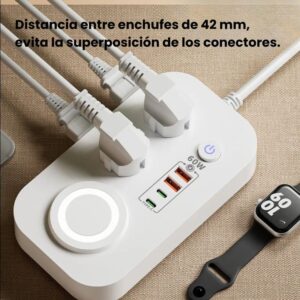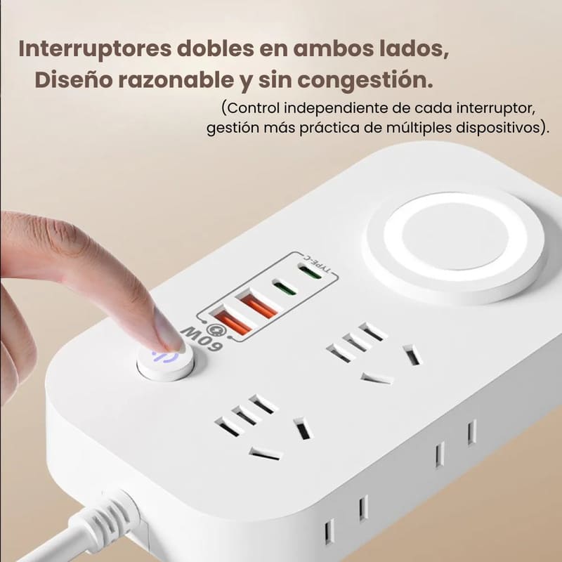 Regleta multifuncional de alta eficiencia con carga rápida USB de 60 W y cargador inalámbrico Qi de 10 W, diseñada para optimizar puestos de trabajo y mejorar la seguridad eléctrica en entornos profesionales.