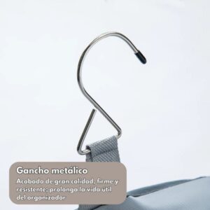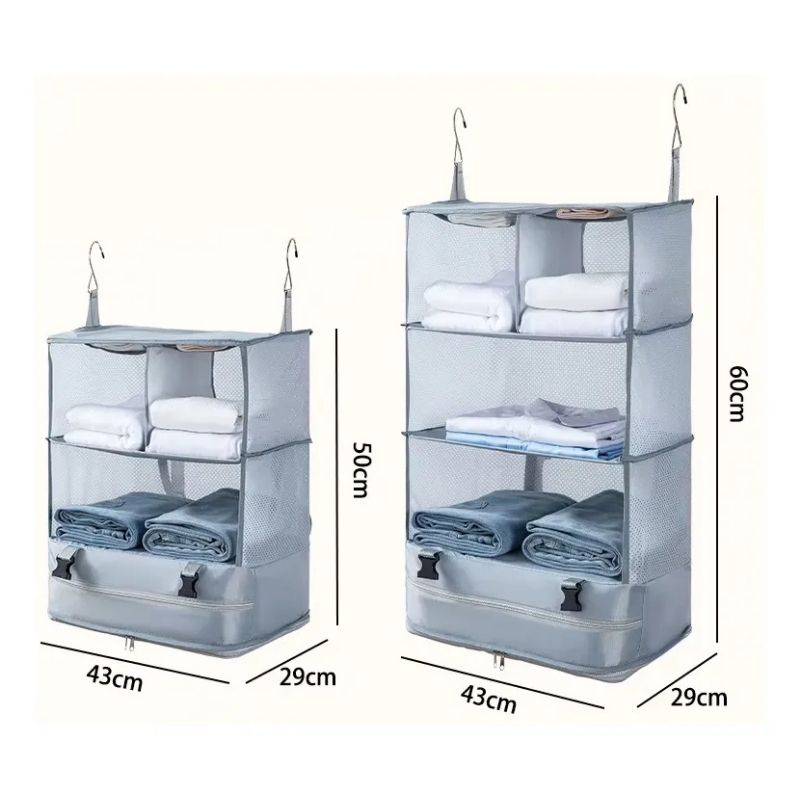 Su sistema de estantería portátil se despliega fácilmente y se cuelga en el armario del hotel o habitación, transformándose en un organizador vertical.
