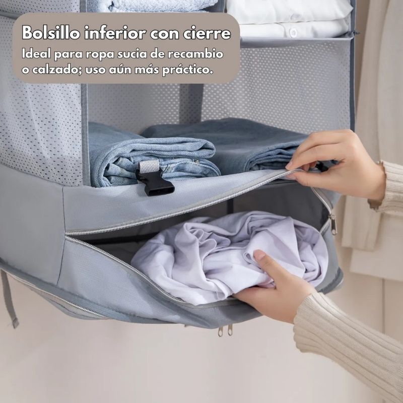El nivel inferior incluye un bolsillo cerrado para separar ropa usada, toallas o calzado, manteniendo el resto del contenido limpio y fresco.