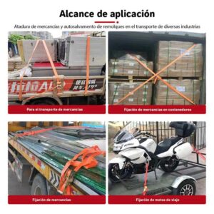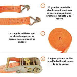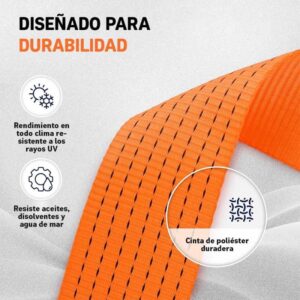 Correa de amarre profesional con trinquete, diseñada para asegurar cargas de forma rápida, firme y segura en logística, transporte y uso industrial. Ideal para operaciones de traslado frecuente y sujeción confiable.