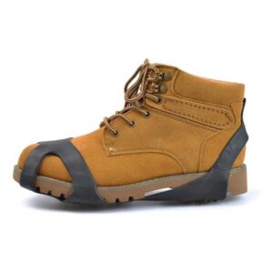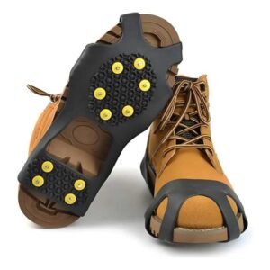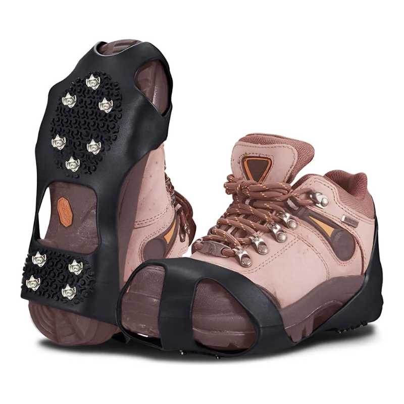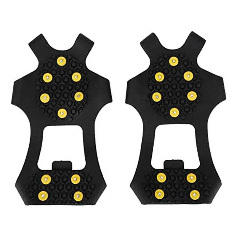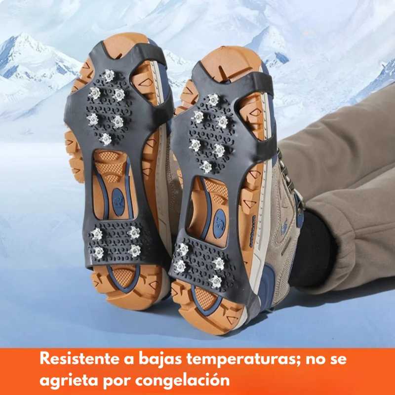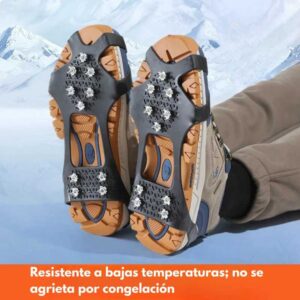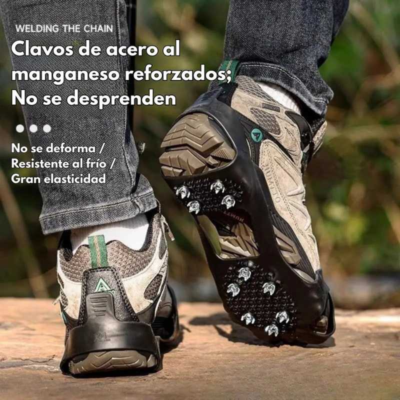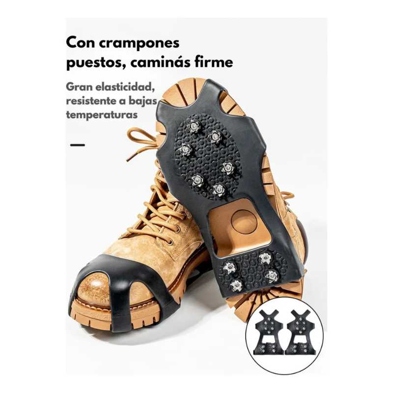 Crampones antideslizantes de 10 clavos metálicos, diseñados para brindar tracción segura en superficies con nieve o hielo. Fabricados en caucho elástico resistente, se adaptan a distintos tipos de calzado y se colocan fácilmente.