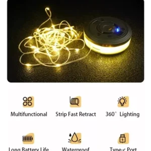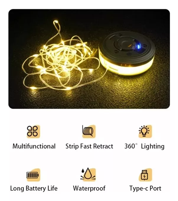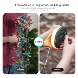 Diseñada con un sistema enrollable, esta tira de luz de 10 metros se pliega fácilmente hasta alcanzar un tamaño compacto. Ocupa poco espacio, ideal para acampar y actividades al aire libre.