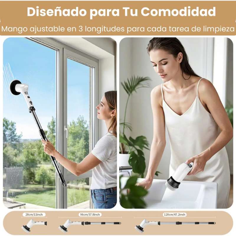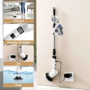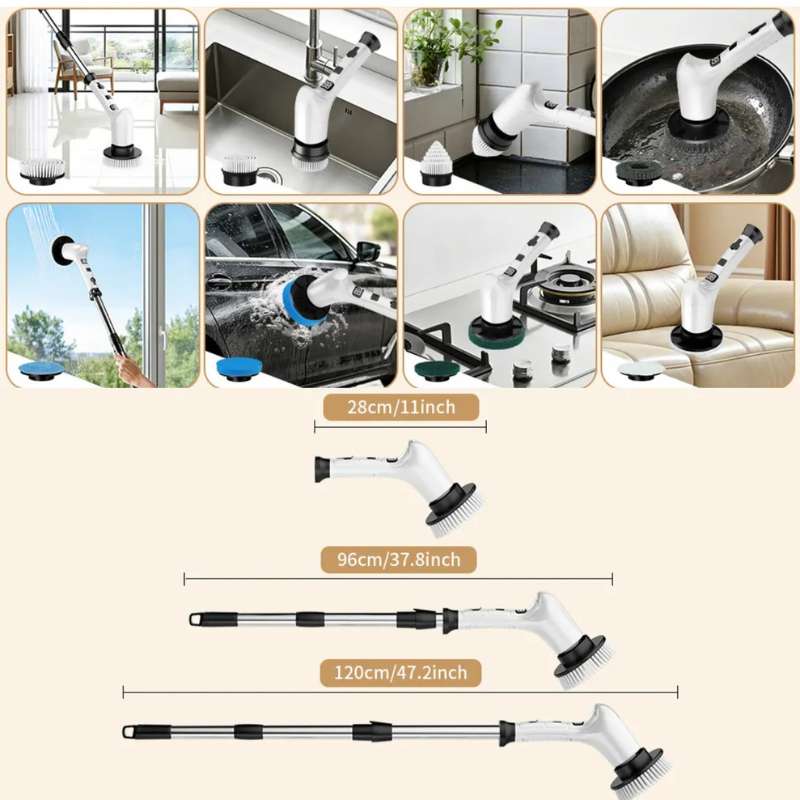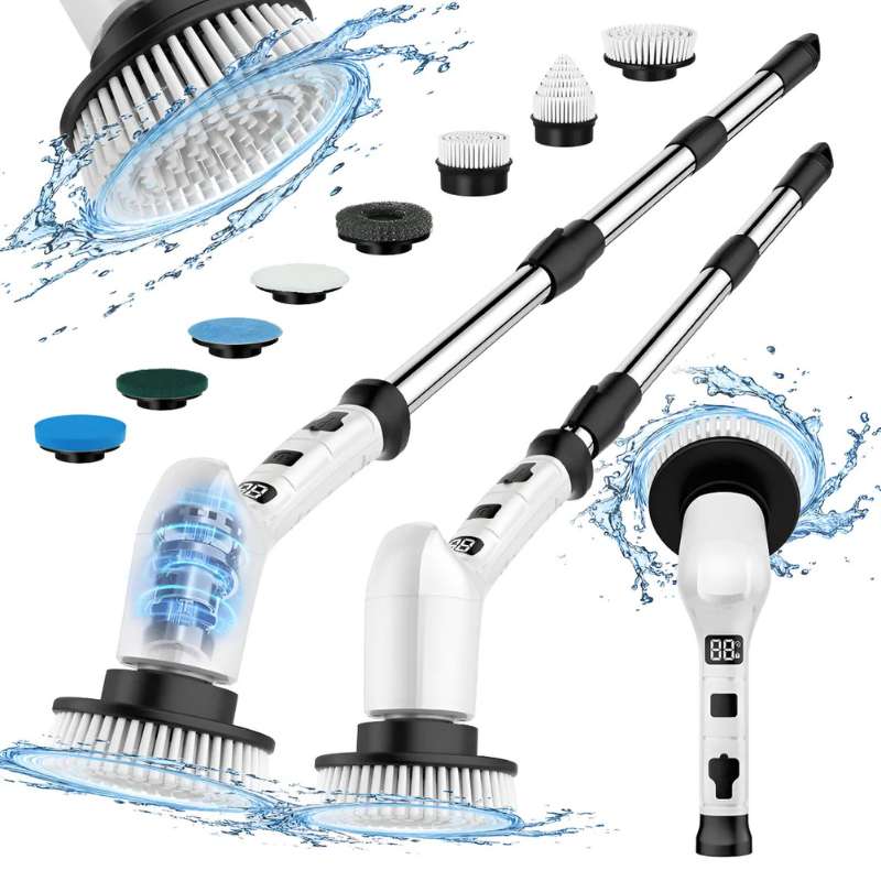 Limpiador eléctrico giratorio 8 en 1 con motor potente, mango telescópico y batería USB-C. Ideal para limpieza profesional o doméstica en baños, cocinas, pisos y superficies difíciles. Perfecto para negocios que buscan productos de alta rotación, multifuncionales y duraderos.