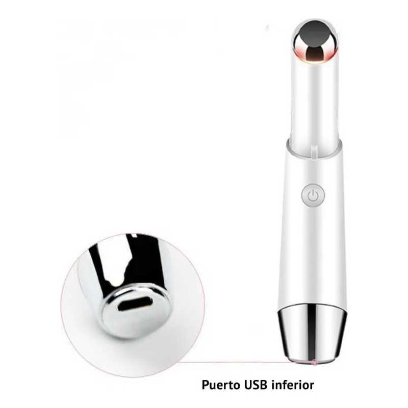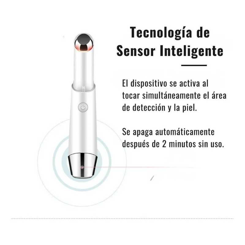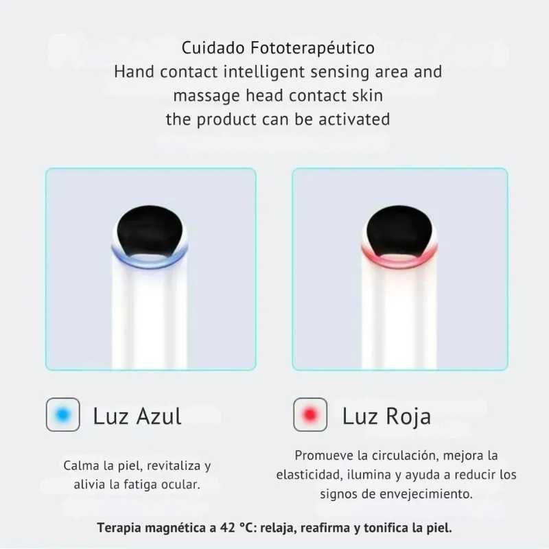 Masajeador iónico portátil con luz LED y función térmica a 42 °C, diseñado para rutinas de cuidado profesional. Optimiza la absorción de productos, reduce signos de fatiga ocular y mejora la apariencia de la piel en tratamientos estéticos domiciliarios o comerciales.