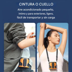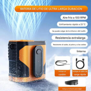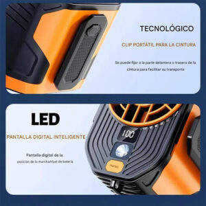Ventilador portátil manos libres diseñado para uso continuo en trabajo y actividades al aire libre. Incorpora batería recargable de alta capacidad, sistema de sujeción a cintura o ropa y luz integrada, ofreciendo ventilación constante, autonomía prolongada y máxima practicidad para uso profesional.