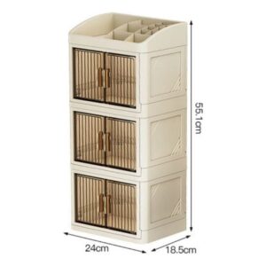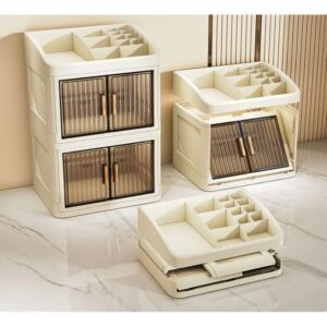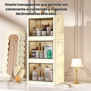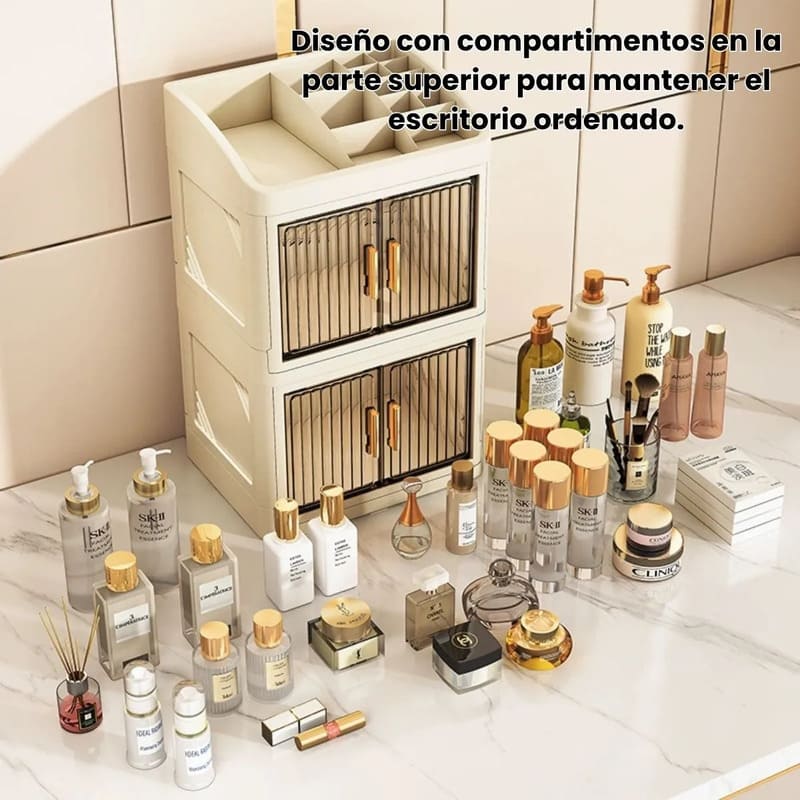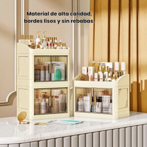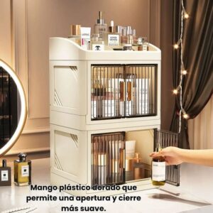 Ordená con estilo y practicidad con el Organizador de Maquillaje de 4 Niveles con Doble Puerta. Su diseño apilable y moderno mantiene tus cosméticos, perfumes y accesorios protegidos del polvo mientras realza la estética de tu tocador o baño.