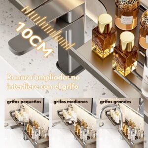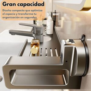 Con 9 cm de altura, 14 cm de ancho y 56 cm de largo, este organizador se adapta perfectamente sobre el grifo sin ocupar espacio extra. Su tamaño ideal permite mantener a mano tus accesorios diarios, optimizando cada rincón con estilo y practicidad.