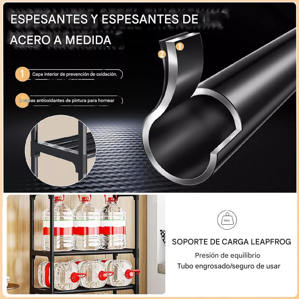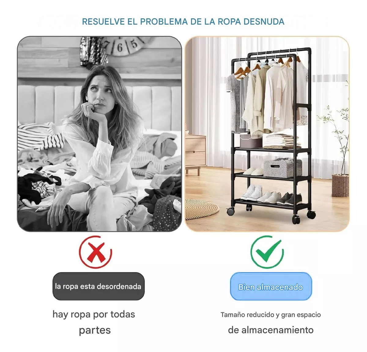 Cada nivel tiene un propósito específico para colgar ropa, almacenar zapatos y bolsos, manteniendo todo organizado y a la vista.
