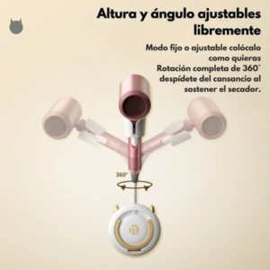 Giralo en cualquier dirección para encontrar el ángulo perfecto. Su diseño ajustable te permite secar y peinar el cabello sin esfuerzo, manteniendo las manos libres para mayor precisión y confort.