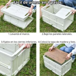 ¡Listas para usar en segundos! Solo levantá el marco, bajá los paneles laterales, ajustalos en los cierres inferiores y colocá la tapa de madera. Sin herramientas ni complicaciones, tendrás tu caja armada y lista para guardar o transportar lo que necesites.