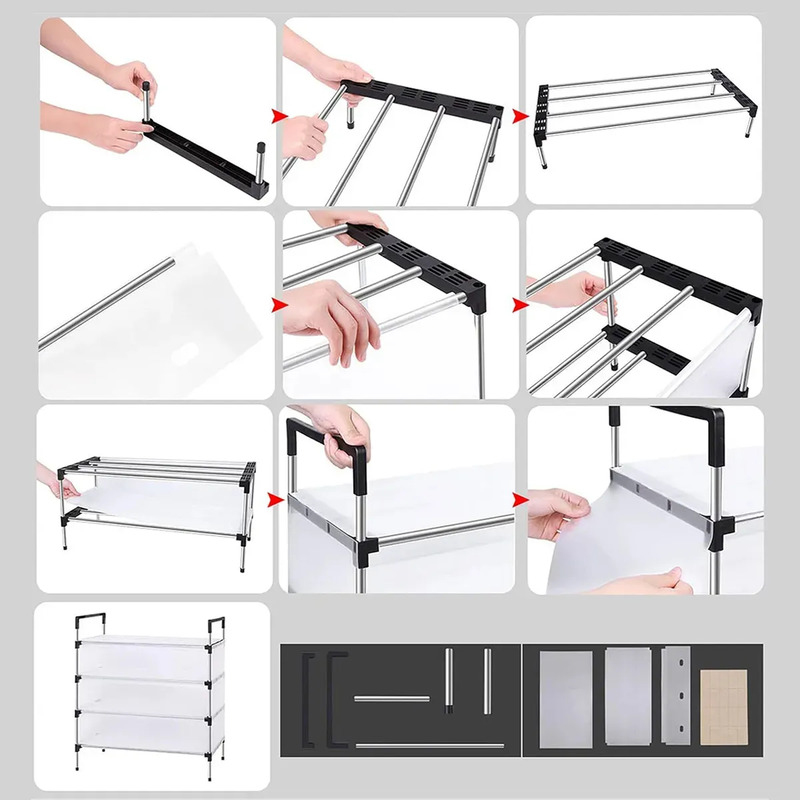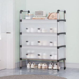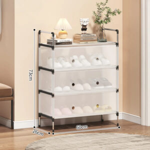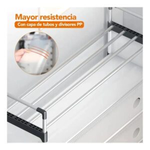 Fabricado con tubos de acero y paneles de polipropileno (PP) de alta densidad, ofrece estabilidad y resistencia al uso diario. Su estructura sólida evita deformaciones o movimientos inestables, soportando varios pares por estante.