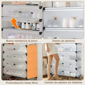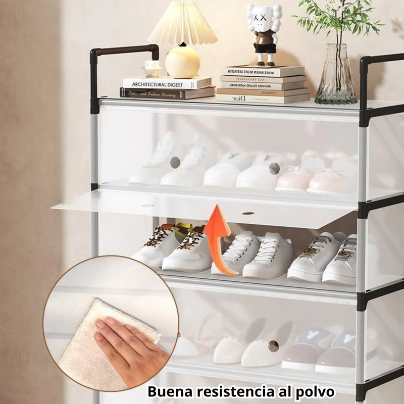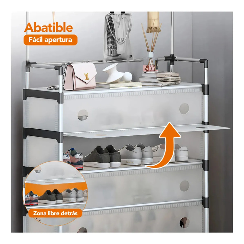 Cuenta con una tapa frontal abatible con diseño plegable de 180°, que permite acceder fácilmente al interior. Esta cubierta evita la acumulación de polvo en el calzado, manteniéndolo limpio por más tiempo.